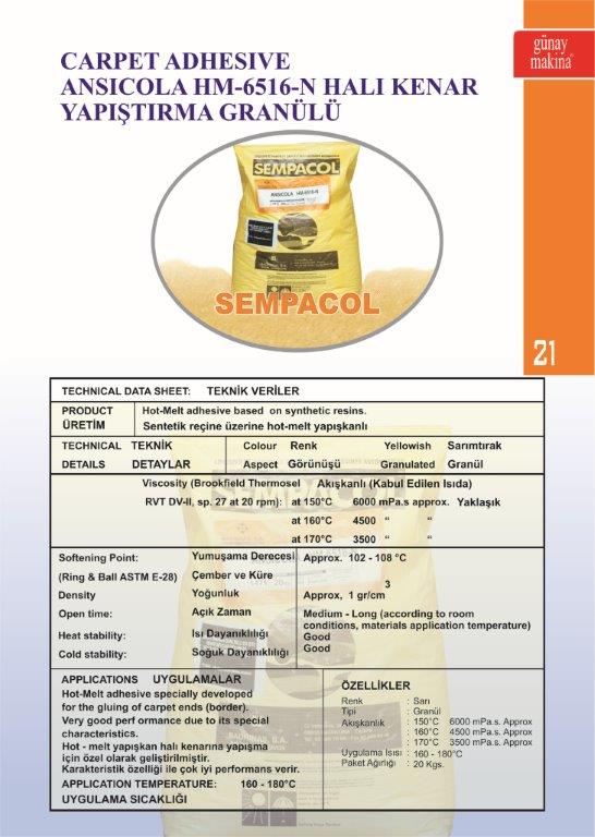 | Hot-Melt Yapışkan halı kenarına yapışma için özel olarakı geliştirilmiştir. Karakteristik özelliği ile çok iyi performans verir. |